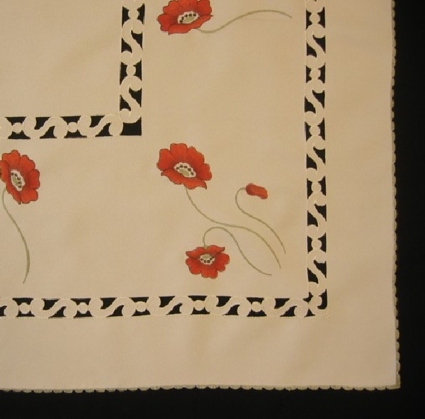 Beschreibung: Tischläufer / Deckeli besticktQualität (Stoff): PolyesterStickereifarbe: farbigGrösse: 35x75cmDesign: MohnWaschen in der Waschmaschinebei 40° CNicht bleichenFür Trockner geeignetMässig heiss bügeln